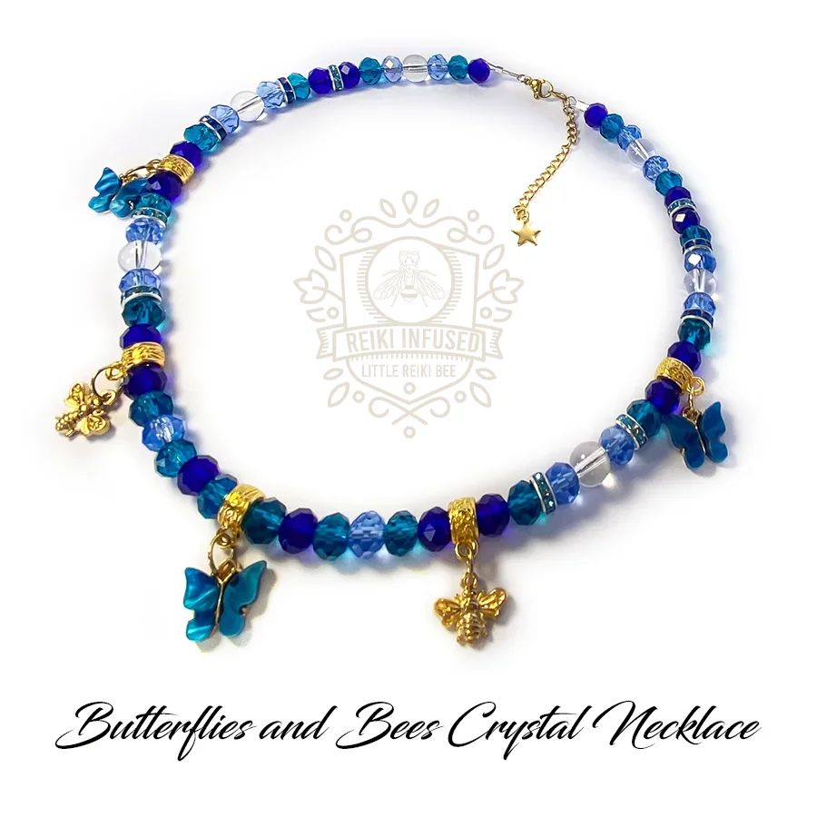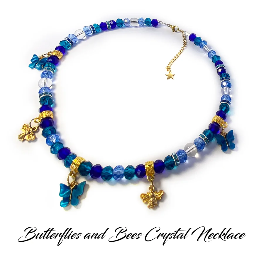 Embrace the gentle magic of nature with this Butterflies and Bees Crystal Necklace. Each piece is lovingly handcrafted with shimmering glass beads that sparkle and catch the light in the most enchanting way, evoking the delicate dance of butterflies and the hum of busy bees in a sunlit garden.