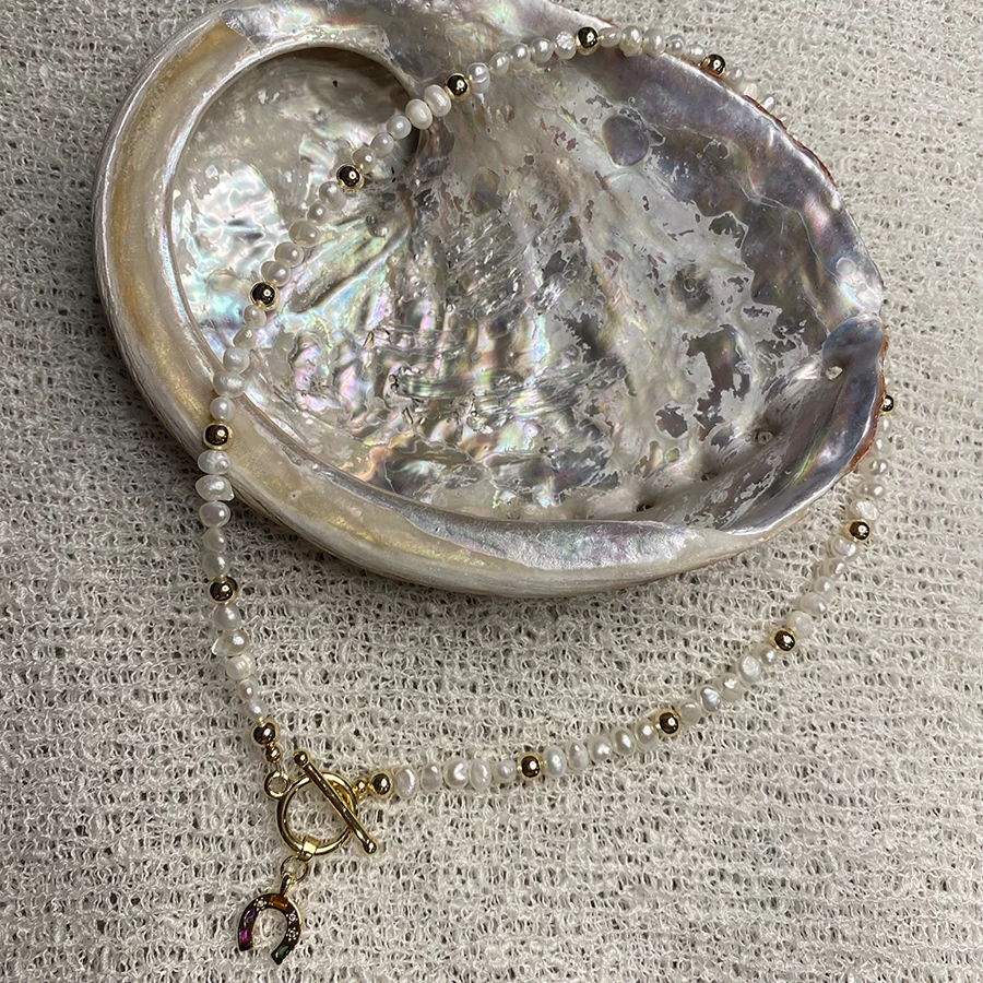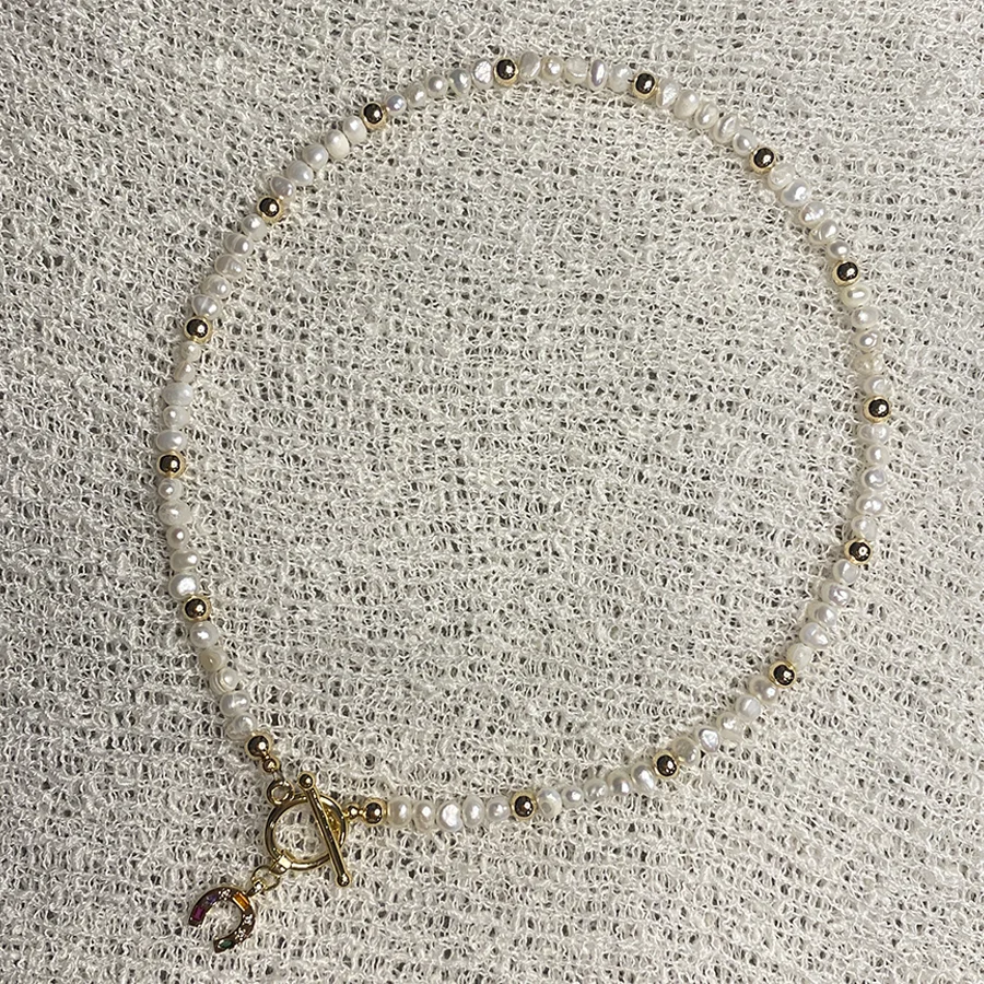 Bring timeless charm to your wardrobe with this graceful handmade necklace, featuring lustrous AAA-grade freshwater pearls, each carefully selected for their radiant sheen and elegance. The strand is beautifully accented with a dazzling 18k gold-plated horseshoe charm, encrusted with colourful cubic zirconia stones for a vibrant, eye-catching sparkle. Symbolizing luck and charm, this elegant and meaningful piece blends classic pearl beauty with a playful, modern twist. Perfect for special occasions or everyday wear, it’s a timeless accessory that effortlessly combines artisan craftsmanship with contemporary sophistication.