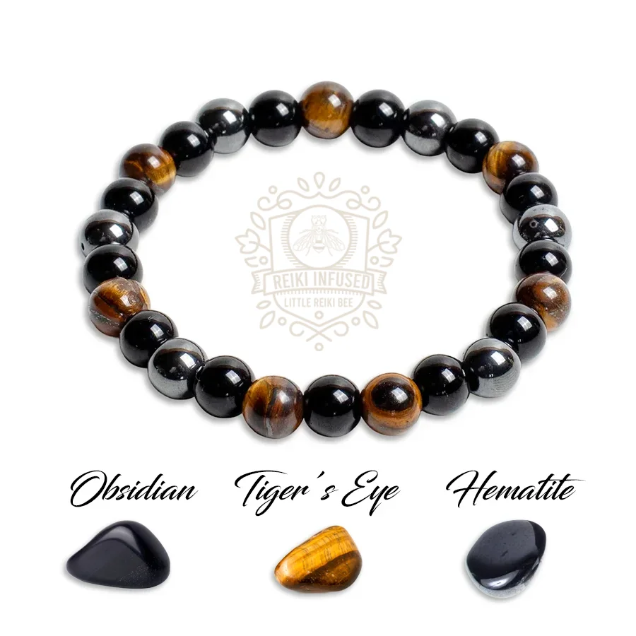 Powerfully grounding, boldly protective and beautifully handcrafted. The Triple Protection Bracelet is handmade and a harmonious fusion of three of nature’s most potent stones: Tiger’s Eye, Hematite and Obsidian.